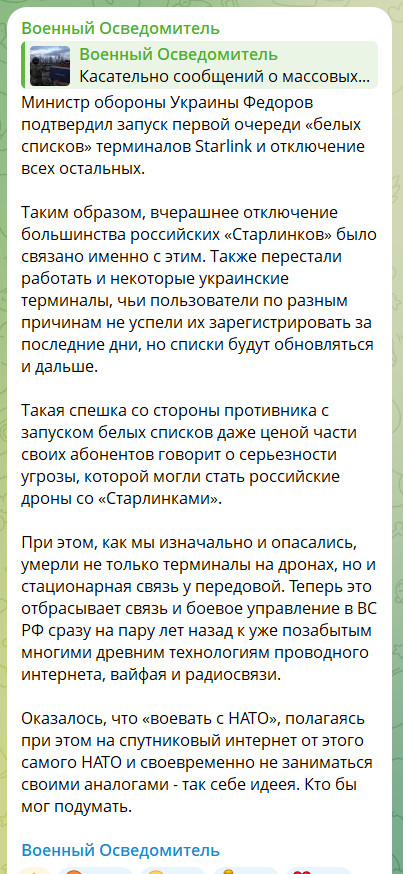 Позор для Маска и США тот факт, что армия Педерации построила свою связь на старлинках и уже многие месяцы на них работает.