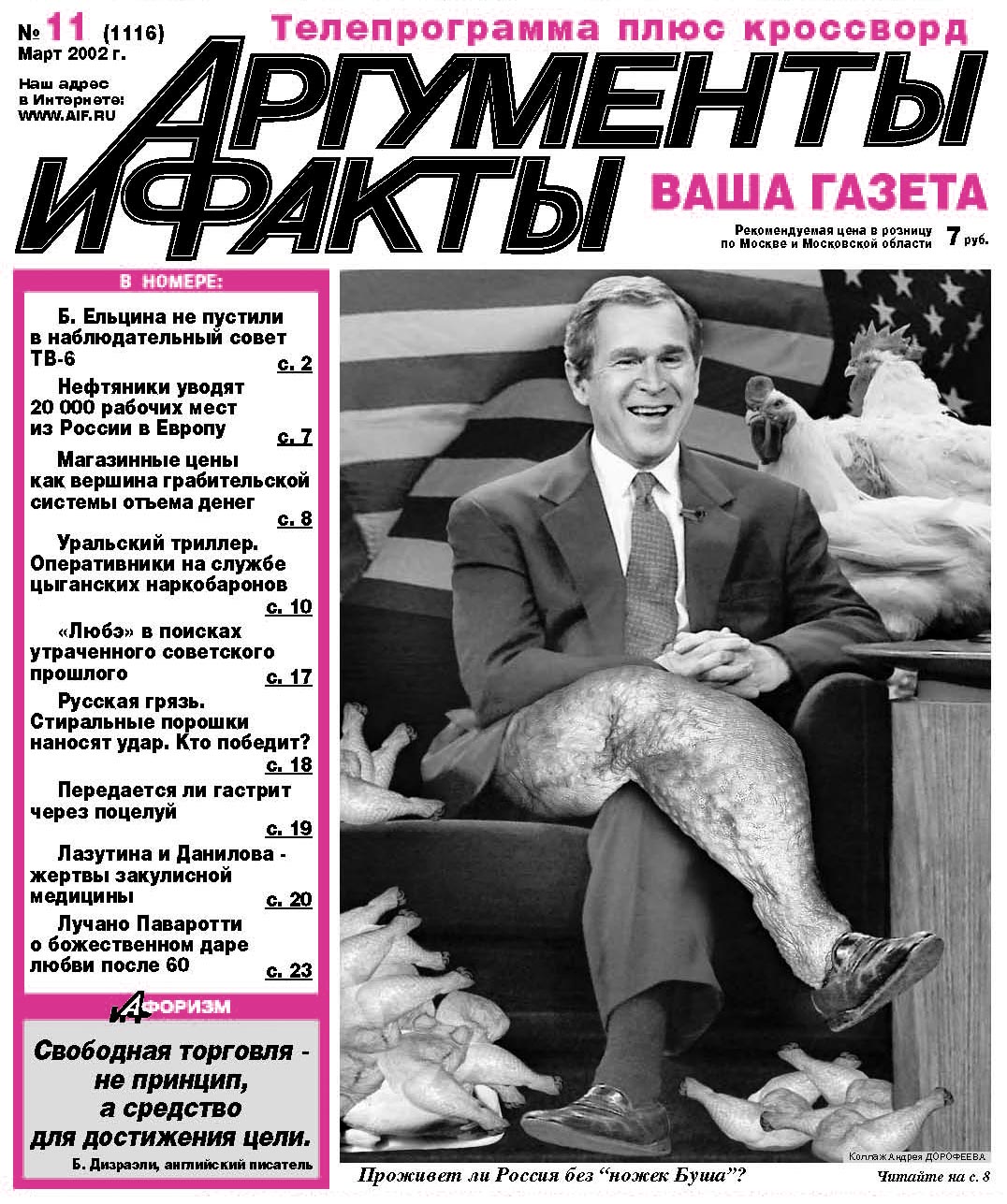 Но если эти ножки были напичканы антибиотиками и гормонами (кстати, а в российских птицефабриках птица ничем таким не напичкана, правильно?), то это значит получается, что сам президент Ельцин договорился с американцами, что они будут вредить здоровью россиян?