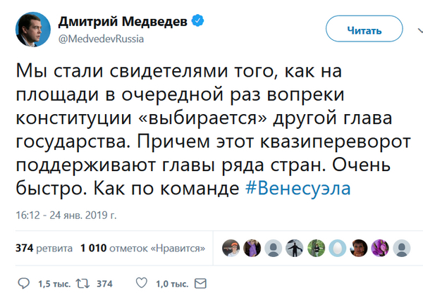 А вы читаете твиттер Медведева? Нет, сам твиттер-то читать никакого смысла нет: сидит какой-то нанятый мутный пряник и строчит в твиттор поразительно унылую хрень из методички. Зато комменты там - огонь, вот их я читаю. Народ благодарит главу правительства за эффективную работу, желает всего самого наилучшего. Вы почитайте, почитайте. Вот хоть здесь, например.
