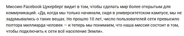 Не перестаю удивляться таким людям. Фб - такой же инструмент как жж,  вк, одноглазники и тд. Так случается,  что интересующий контент располагается один в однос,  другой,  в другом месте. И что теперь из личной неприязни к цукербергу не читать то,  что мне интересно в фб? Глупость какая.