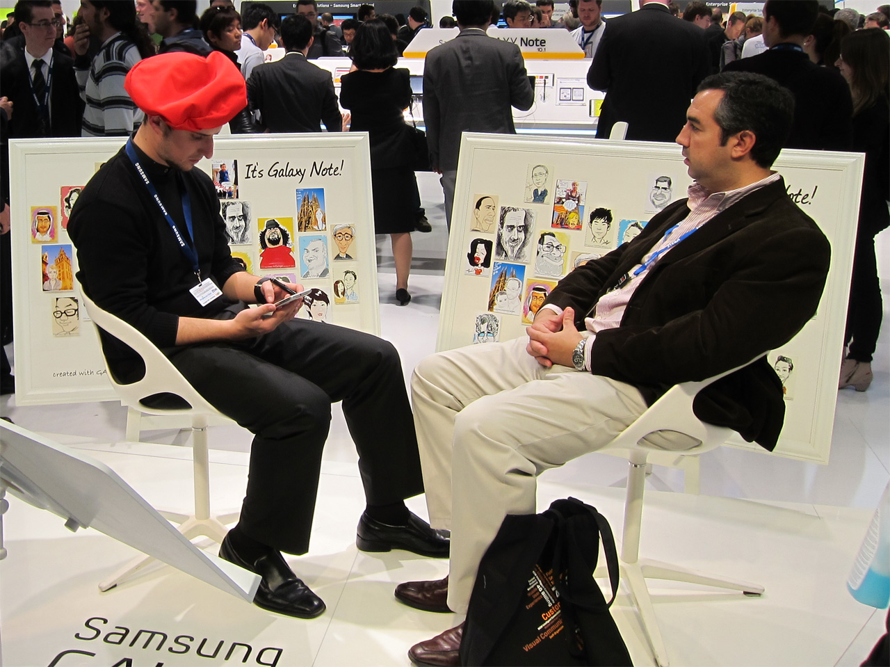 Я долго и мучительно пытался понять, в чем его отличие от Galaxy Tab 2 10.1. Выяснилось, что практически только в том, что Note традиционно снабжен стилом (а точнее, вакомовским пером S-Pen) для рисования, причем на всех выставках Samsung делает на этом большой упор - мол, рисовать на Note очень и очень удобно. На данной выставке был открыт отдельный павильон с рисунками на Note и Note 10.1, а на основном стенде сидели художники в венецианских шапочках, которые рисовали на планшете Note всех желающих.