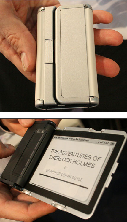 Суть - к лету в Европе может появиться в продаже такая книжка с разворачивающимся экраном и поддержкой GPRS/EDGE для скачивания книжек из интернета (по аналогии с амазоновским ибуком, т.е. ни разу не телефон, а просто электрокнига с коннектом). А разработчики её, выделившиеся в автономное подразделение из Philips пару лет назад, тоже никаких телефонов ещё не проектировали - они лишь говорят, что им было бы интересно заняться с кем-нибудь на пару созданием такого мобильника, и видят в этом потенциал. Т.е. мобильника, как такового, ещё и в проекте нет, есть лишь идея о том, что подобное можно создать.