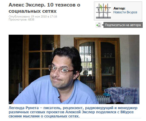 Кстати, о социальных сетях. Не так давно давал интервью для издания "ВКурсе" - это проект "ВКонтакте", распространяется как приложения для "ВКонтакте". Вот так это интервью опубликовано, если кому интересно (надо иметь регистрацию во "ВКонтакте" и установить соответствующее приложение).