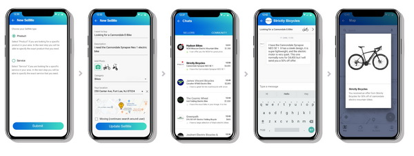В WeBuy вам нужно ввести текстовый запрос или фотографию и радиус поиска. Все подходящие магазины в округе получат ваш запрос, и если у них есть нужный товар, его сфотографируют и пришлют вам предложение. Вы выберете лучшую цену и сделаете покупку. А если вы шли по улице и встретили на ком-нибудь подходящие тапки, можно сфотографировать их украдкой и сразу забить в поиск, указав ваш размер и локацию, и тогда вам напишут обувные лавочки, у которых они есть. Ну разве же не прелесть? Система не следит за пользователем и не спамит тем, что вы не заказывали; ваш запрос видят только те магазины, которые находятся в вашем радиусе, и это происходит в реальном времени.