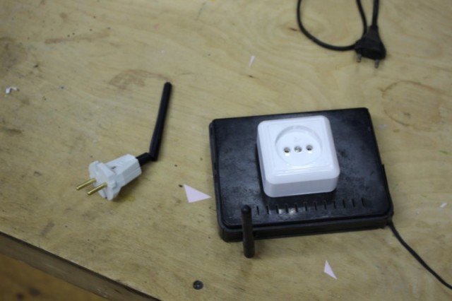Журналисту демонстрируется вот такая прелесть: штепсель с антенной и обычный роутер Wi-Fi с приклеенной к нему розеткой.