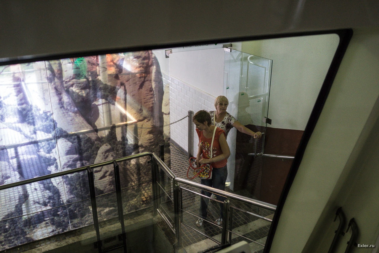 Достоялись, зашли в вагончик. Машинистка вагончика, проверив билеты и запустив народ, закрыла вход на цепочку, закрыла дверь и пошла в верхнюю кабину. В этот момент явились какие-то туристы, которые перелезли через цепочку, открыли закрытую дверь и стали пытаться ломиться в вагончик через закрытые двери. Я готов был поспорить на миллион долларов, что это - российские туристы. (Они ими и оказались.) Только российские туристы отличаются таким редкостным дуболомством и нежеланием соблюдать никакие правила, в том числе - правила безопасности. Странно, что эти тетки не вперлись в нижнюю кабину машиниста: она была пустая и там была приоткрыта дверь.