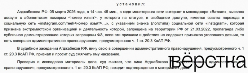 Как говорится в судебном решении, у местного жителя в статусе личного аккаунта в заблокированном на территории России WhatsApp «в свободном доступе» была размещена «ссылка перехода в социальную сеть instаgram.com/reel/», с указанием значка (логотипа) социальной сети instаgram, которая признана экстремистской организацией».