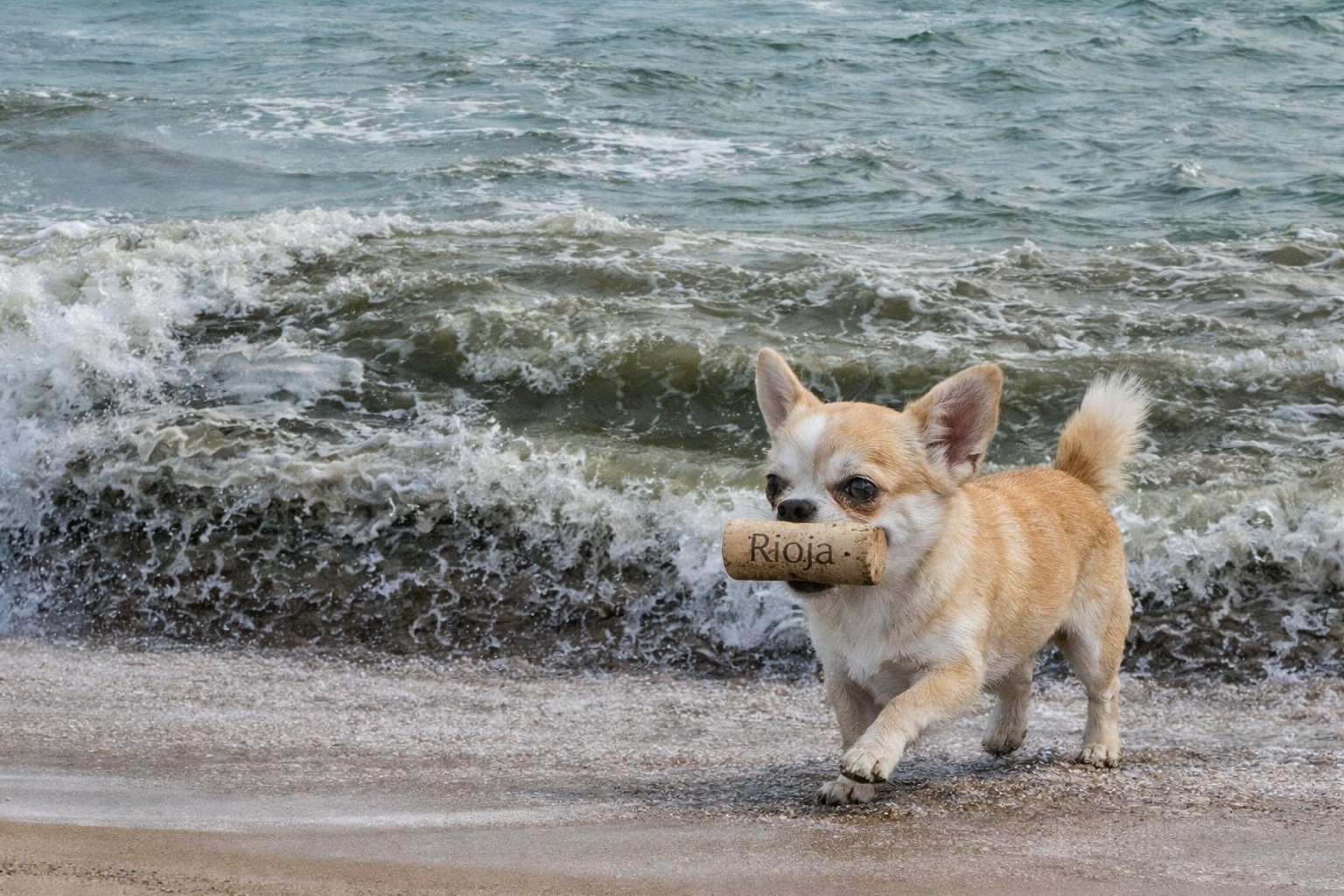 Первое же фото - чуть с другого ракурса: непонятно, почему купаться не пошли? Я так предположу, что, судя по пробке в зубах у собаки, бутылка Риохи уже была открыта, а потому - было принято решение перейти сразу к выпивке, минуя стадию купания.