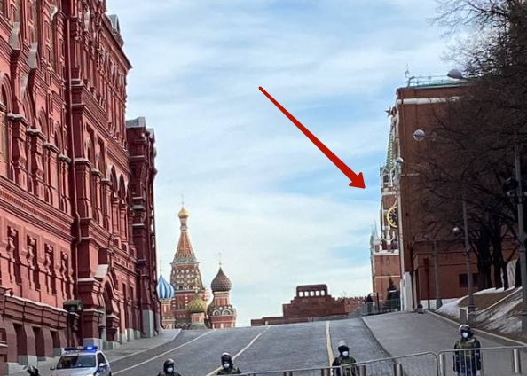 Спасская башня притаилась за углом дома и опасливо выглядывает.