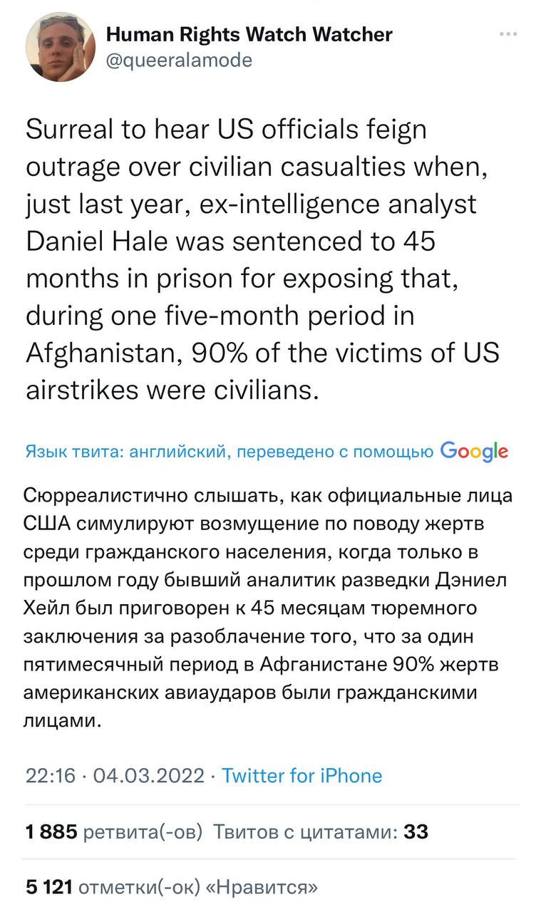 Перекручено, как обычно. Хейл был осужден не за разоблачение как таковое, а за передачу секретных материалов третьим лицам. В статье также сказано по-другому, чем в твите: что 90% жертв были не "гражданскими лицами", а "не теми, кому предназначался этот авиаудар". То есть, это были люди, которые находились рядом, и как утверждает сам Хейл, это могли быть как родственники террориста, так и просто некие бородатые мужики, которые мирно пили чай. Что сказано в документах мы вообще не знаем, потому что их не читали ни вы, ни я 😄 Но я хотя бы прочитал письмо Хейла судье.