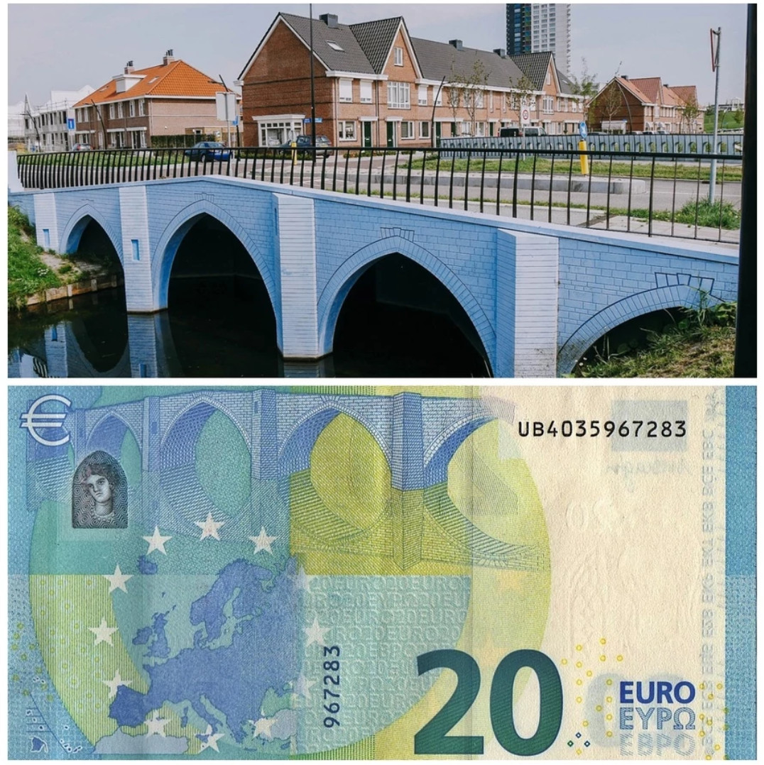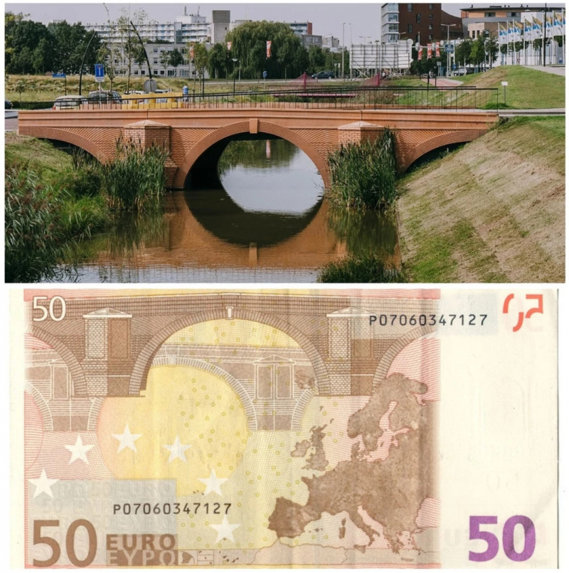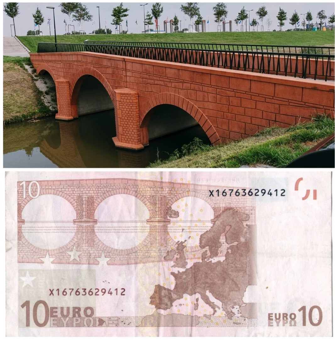 У Анны Монгайт в ТГ наткнулся на историю, о которой раньше не слышал. Много лет я пользовался банкнотами различных номиналов с евро, и как-то никогда не задумывался, что за мосты изображены на этих банкнотах. Думал, что это какие-то реально существующие мосты.