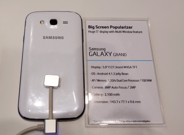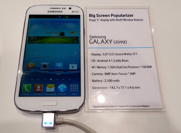 Ну и, понятное дело, Samsung нужно продолжать завершать смычку между городом и деревней. То есть переход от смартфона к планшету, равно как и от планшета к телевизору, должен быть незаметным. В рамках этой программы они представили маленький пятидюймовый смартфончик под названием Galaxy Grand. Это для тех, у кого Galaxy Note теряется в ладошке и его сложно обнаружить. Grand уже точно обнаружите, не вопрос!