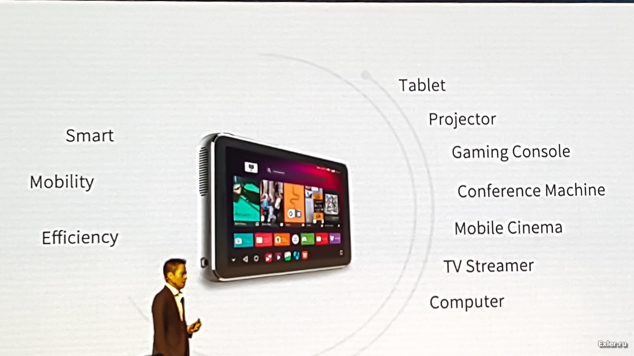 Но вернемся к новому проектору-планшету. Господин Зенг предпочитал о нем говорить как о планшете с проектором. И там даже прозвучала фраза из серии "Мы первые в мире сделали планшет с проектором", после чего я сразу нервно заикал, вспомнив свой Lenovo Yoga Tablet 2 Pro, который, кстати, представляли на MWC всего-то два года назад.