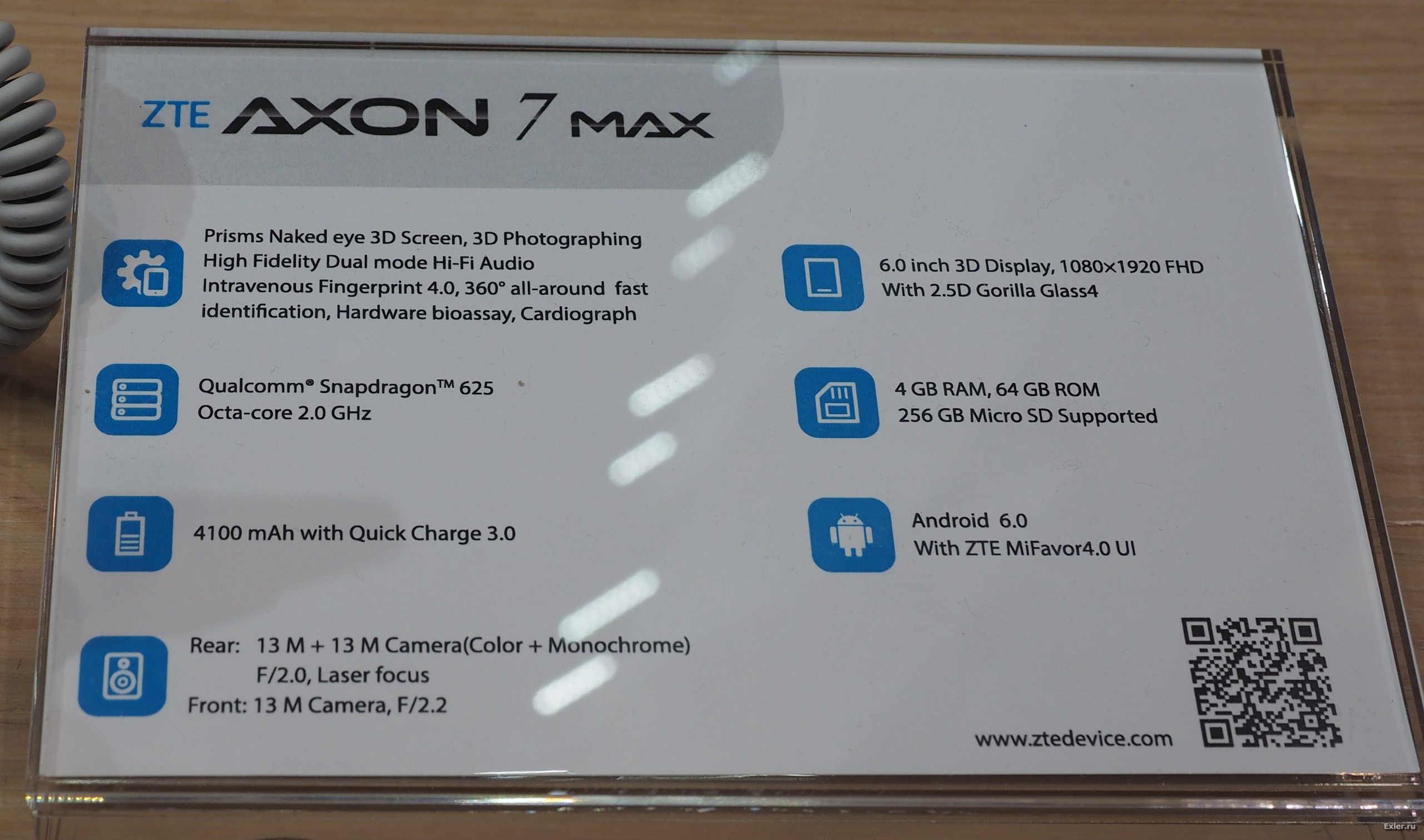 Стенд ZTE. Я как раз недавно писал обзор ZTE Axon 7 - очень достойный телефончик оказался, его показывали на стенде ZTE. Также, как выяснилось, есть еще две его модификации - Axon 7 Max и Axon 7 Mini.