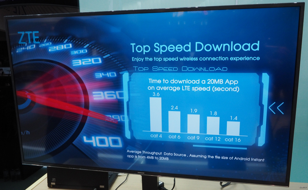 Ну и в рамках широко обсуждаемой на выставке концепции сети пятого поколения - 5G - ZTE представила на стенде первый в мире "гигабитный смартфон", способный принимать до гигабита в секунду по мобильной связи. Это примерно в 50 раз быстрее обычной пропускной способности мобильных каналов в США.