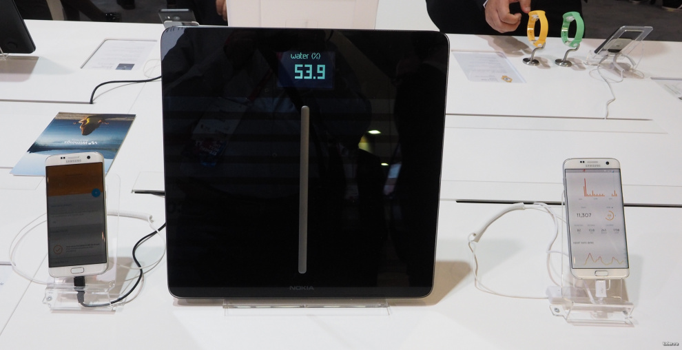 Совершенно революционная разработка - "умные весы". Показывают вес плюс всякие дополнительные данные, вроде процентного наличия жира и мышечной массы. Запоминают данные в облаке - передают через WiFi. Вообще такие весы впервые появились лет десять назад. У меня они с 2012 года, до сих пор работают отлично.