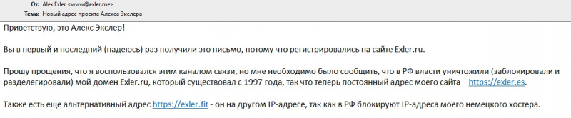 После блокировки exler.ru не получал никаких сообщений на свою почту (gmail). Пару дней спустя решил поискать Вас в Telegram, где и обнаружил сообщение о переходе на новый домен...