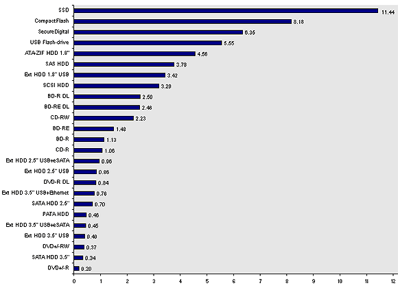 Толковая статья "Современные медиа-носители - что выбрать для большого файлового архива". Там еще приведена интересная табличка, в которой расписана стоимость мегабайта для самых разнообразных устройств. Очень наглядно (я привожу немного уменьшенный вариант).