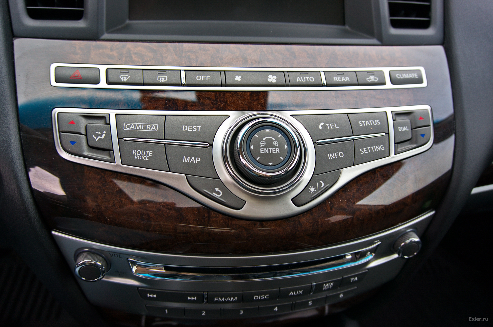 Второй ряд - подстройка климат-контроля, управление основными фукнциями на дисплее (камера, навигация, карта, телефон, информация) с центральным управляющим элементом (курсоры, поворотное колесо, кнопка Enter).