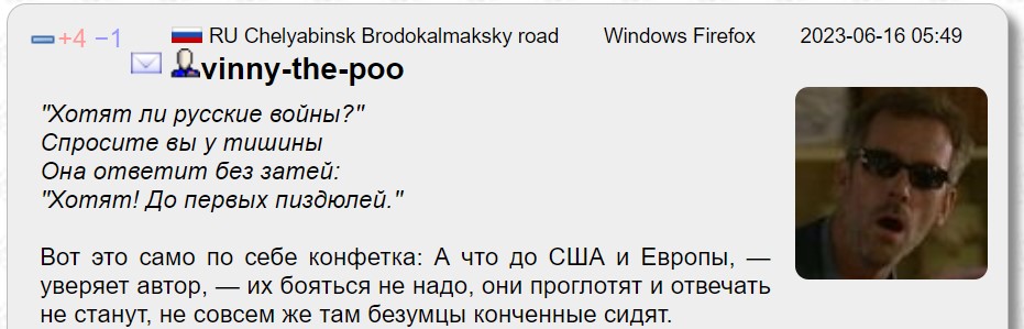 Поэтому, — развивает мысль автор, — логичным выходом являются ядерные удары по «странам, поддерживающим киевский режим». И это спасёт мир и сохранит цивилизацию. Мол, мир так отвык бояться ядерной войны, что следует его вернуть обратно в чувство этой самой ядерной войной («оружием Бога»). А что до США и Европы, — уверяет автор, — их бояться не надо, они проглотят и отвечать не станут, не совсем же там безумцы конченные сидят...