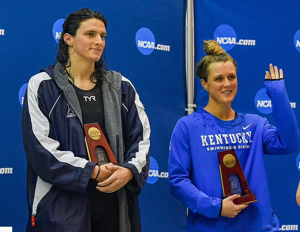 Ниже - Райли Гейнс с трансатлетом Лиа Томас, когда они разделили 5-ое место на соревнованиях по плаванию среди женщин-студентов американских ВУЗов.