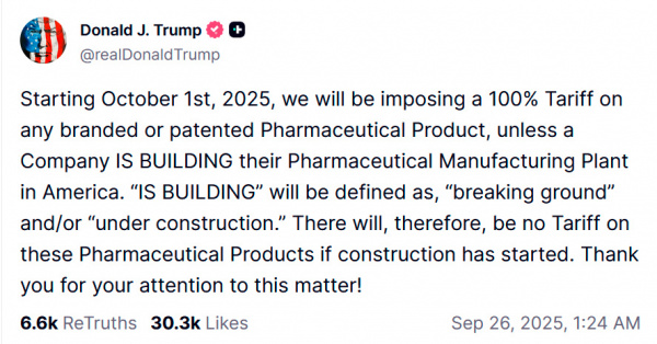 С 1 октября 2025 года мы будем вводить 100-процентный тариф на любые брендовые или патентованные фармацевтические продукты, за исключением тех случаев, когда компания СТРОИТ свой фармацевтический завод в Америке. «СТРОИТ» будет определяться как «начало строительства» и/или «находится в стадии строительства». Таким образом, на эти фармацевтические продукты не будет налагаться тариф, если строительство уже началось. Благодарим вас за внимание к этому вопросу!