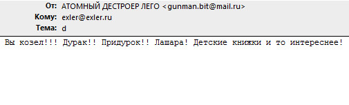 Алекс, а предыдущая переписка с этим адресом была нормальная? Мож кто-то подставил некрасиво обладателя данного почтоваго ящика... Например на общедоступном компьютере (на работе, к примеру) хозяин емайла забыл выйти из почтовика mail.ru., а кто-нить взял и "пошутил"...