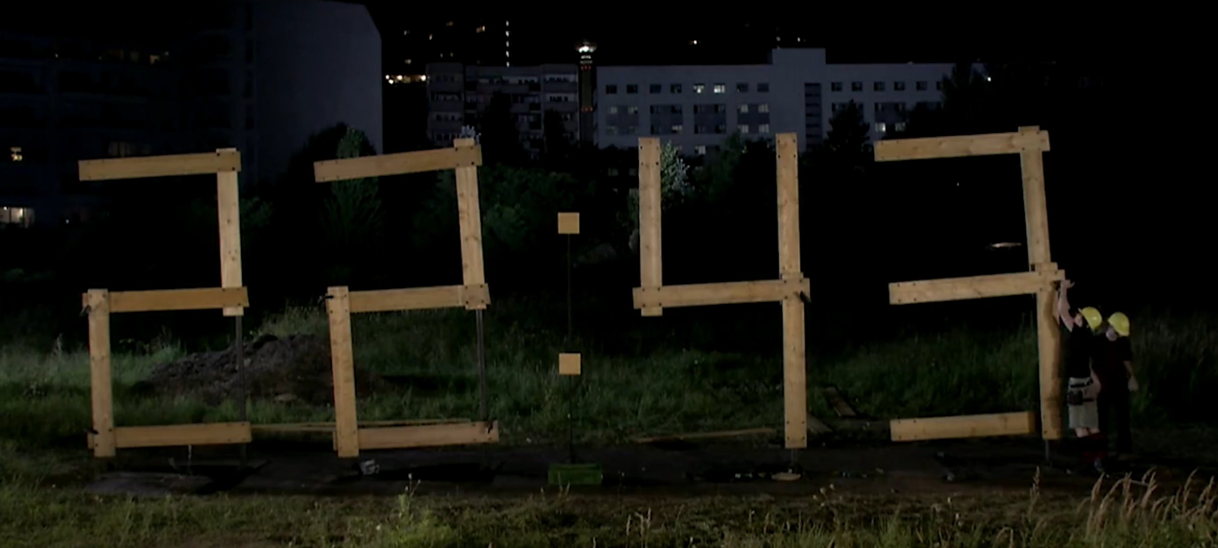 В ходе 12-часовой съемки участники образовали стрелки часов. Если присмотреться, то бегун в оранжевой форме отмечает секунды, совершая один круг каждую минуту.
