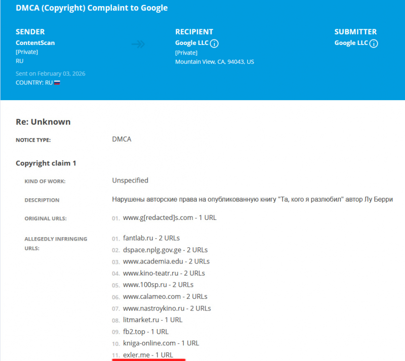 Google прислал мне письмо по поводу "нарушения авторских прав" на моем сайте exler.me. Основной адрес при этом не был упомянут. Прислал ссылку на сторонний сервис, который занимается нарушением авторских прав. Там написано, что у меня на сайте нарушены авторские права на книгу, указанную на скриншоте. При этом жалоба пришла из России. У меня на сайте нет вообще никаких упоминаний этой книги и этой (этого) Л# Б#рри.