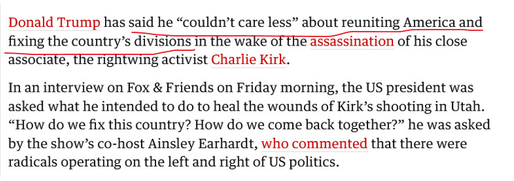 Так что все эти вопли и стенания от республиканцев - это просто парад лицемерия и трайбализма. Кирк был отъявленным мерзавцем. Что, впрочем, никак не оправдывает ни его убийства, ни политического насилия в целом.
