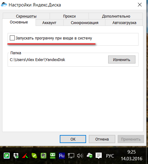 Пришлось тут для какой-то надобности поставить приложение Яндекс.Диск (так-то я пользуюсь Dropbox, у меня там коммерческий аккаунт на 1 Тб). Поставил. Потом, когда дело было сделано, решил программу отключить: не удалять, а просто отключить ее автозагрузку, чтобы в трее не болталась. Зашел в настройки, отметил соответствующую опцию.