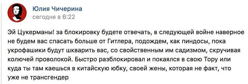 Обожаю певиц ротом "русского мира", больших патриоток и всякое такое. Столько страсти, столько задора и огня - прям любо-дорого посмотреть. От Гитлера она в следующей войне не будет цукерманов спасать, понимаешь. А то ведь Цукерманы страшно напряглись.
