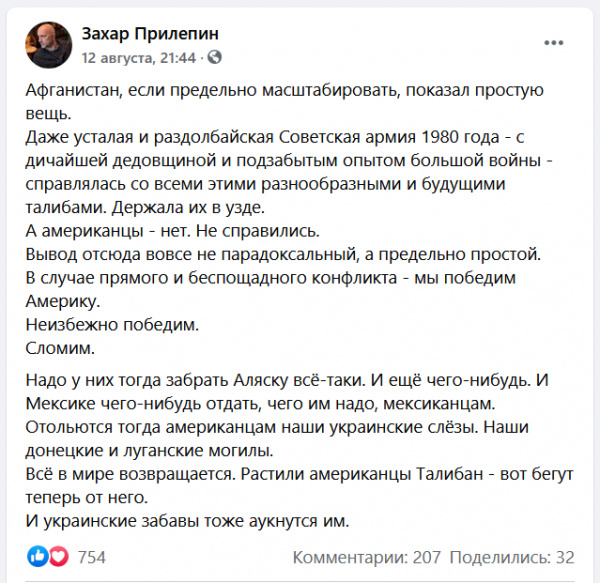 Большой аника-воин Захарка Прилепин тут выдал чудесное. (Скриншот сделал я сам из его ФБ.)