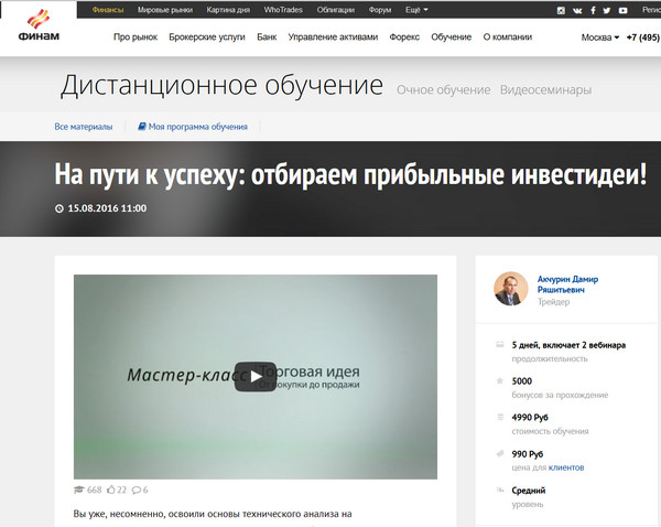 Если опыта пока нет, и вообще не отличаете акцию от акации — вам сюда, на курс Начинающий. Сам его проходил, очень рекомендую. Узнаете, что такое трейдинг, как работает торговый терминал, как совершаются сделки, освоите азы технического и фундаментального анализа. Методика обучения очень эффективная — четыре блока с видеоуроками, на которых профессионал рассказывает и показывает, за ним остается только повторять. Осторожно — курс вызывает острое желание тут же перейти в боевой режим, и торговать самостоятельно! Если что, я вас предупреждал.