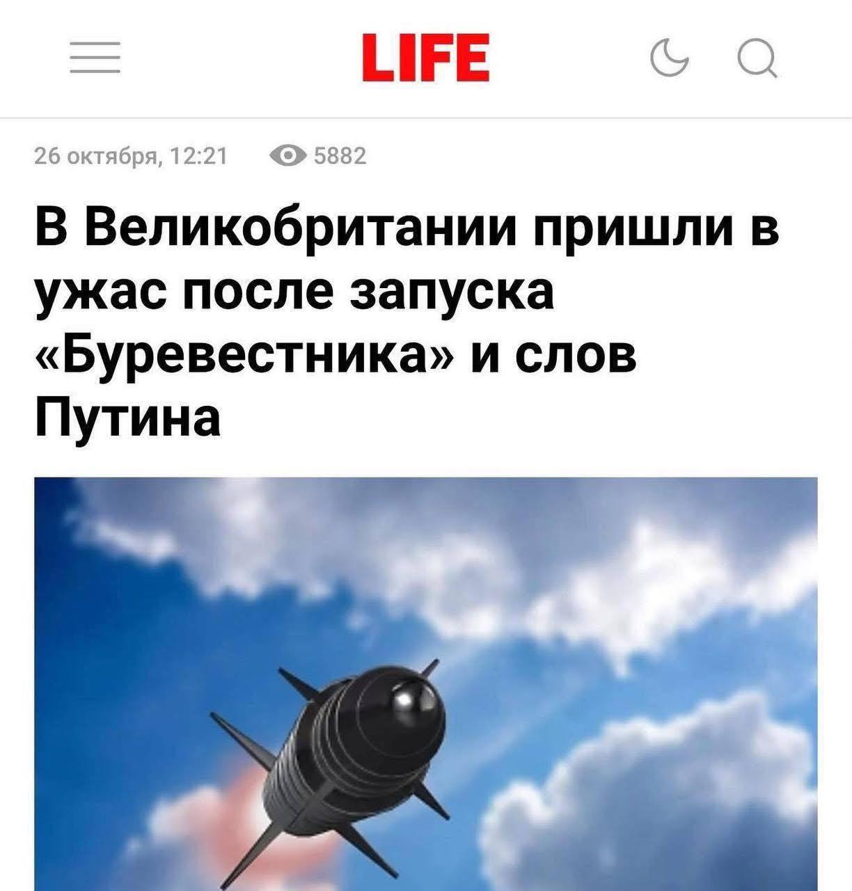 26 октября на совещании с командующими фронтовыми группировками Владимир Путин поручил начать развертывание ракетного комплекса «Буревестник» после успешного завершения его испытаний. Крылатая ракета «Буревестник» с малогабаритным ядерным двигателем испытана 21 октября и по дороге выполняла сложные маневры по вертикали и горизонтали.