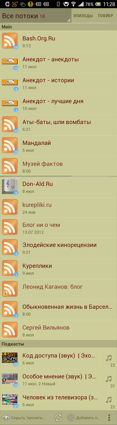 Однако под Android, где я, собственно, все эти подписки и читаю на смартфоне, мне приложение Feedly не нравится, да и с подкастами, которые я слушаю, он работает крайне примитивно. И там я пошел другим путем - просто сделал импорт того же файла subscription в свой любимый BeyondPod, который и с текстовыми подписками отлично работает, и с подкастами - просто прекрасно! (Единственное - перед импортом нужно переименовать subscription.xml в subscription.opml.)