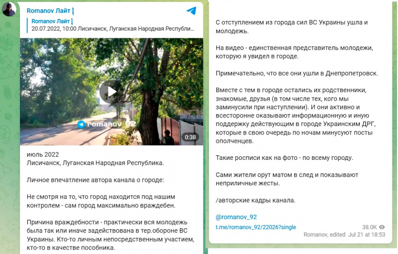Прокремлевский блогер Романов удивляется: ну как же так, освободили же Лисичанск, ну и кто так встречает освободителей? Где цветы, где сало с горилкой? Еще и оказывают всестороннюю поддержку силам ДРГУ, по ночам минусующие посты ополченцев в соцсетях. Матом вслед орут. Ну как так можно-то вообще?