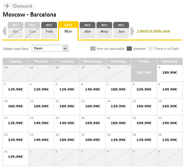 И еще один ценный момент - при покупке билета можешь сразу посмотреть раскладку текущих цен на месяц и выбрать день с минимальной стоимостью билета. Вот, например, на март.