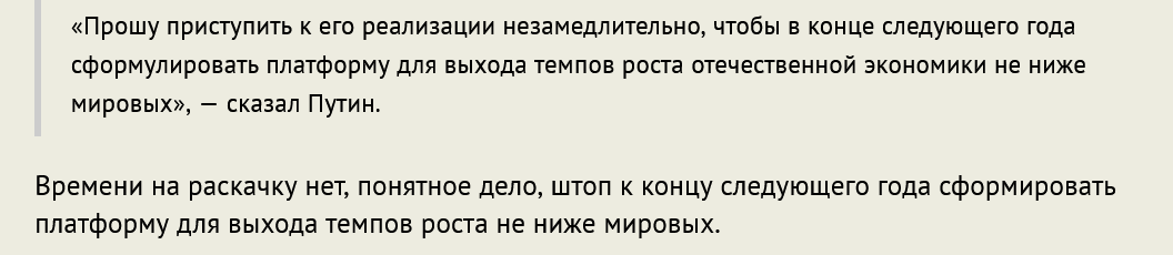 Времени на раскачку нет, понятное дело, штоп к концу следующего года сформировать платформу для выхода темпов роста не ниже мировых.