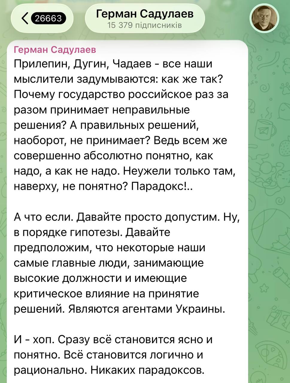 По моему Садулаев тупой, эти бредни что ЦК КПСС агенты СБУ не взлетят, ведь уже лет двести всем известно что во всех бедах Расссиюшки виноваты евреи. От якбы он написал что в Кремле агенты Моссада, начавшие войну с Украиной шоб Россия не смогла помешать Израилю спокойно бомбить Иран тут бы кацапские глубинарии и сказали б "ага". А так какие то смешные хохлы, тьху, небылицы.