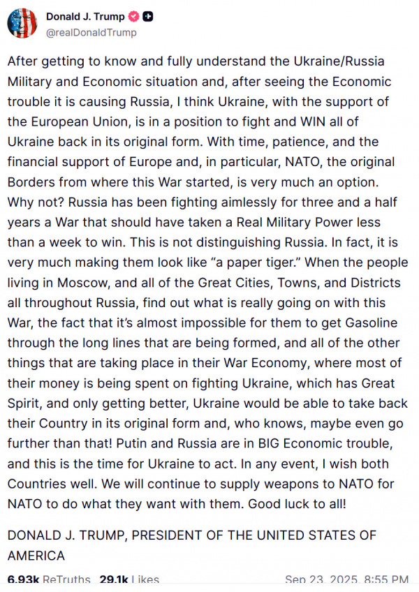 Что это означает? Чисто практически - ничего. Ноль. Какая муха куда клюнула президента очень соединенных штатов, что он вдруг стал заявлять такое - без разницы. Сейчас вот такое заявлял, раньше заявлял, что Зеленскому придется "пожертвовать территориями", то есть сдаться, теперь заявляет, что Украина сможет отвоевать все свои территории и даже больше.