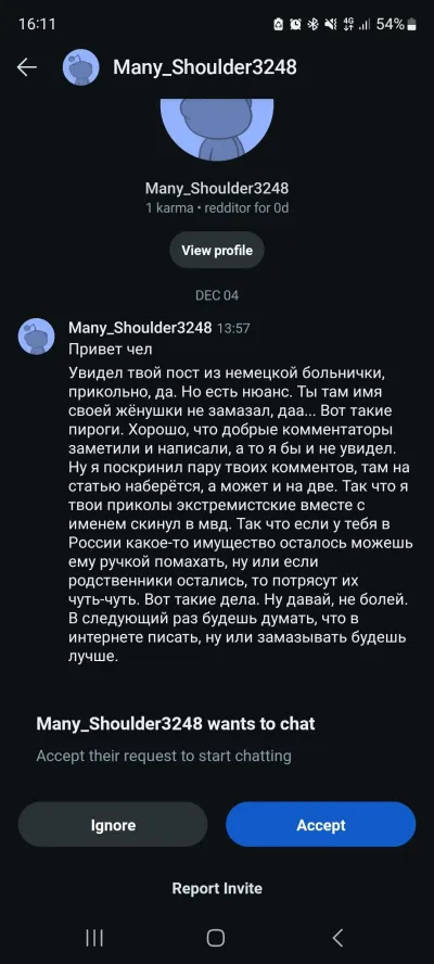 В счете он замазал свое имя, но не замазал имя своей жены, и к нему тут же прибежало вот это недорогое россиянство, которое пообещало немедленно настучать на него товарищу майору. Причем заметьте - он всего-то написал о немецкой государственной медицине. Он даже не назвал Путина Хуйлом и не распространил фейки о героической второй армии мира, которая третий год берет Великую Новоселку. Но доносительство у недорогих россиян (не у всех, конечно) настолько в крови, что это существо прям не могло удержаться.
