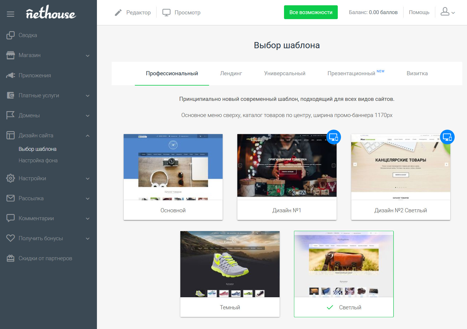 Nethouse постоянно развивается, внедряет новые опции и интеграции. Например, за последнее время появились новые адаптивные шаблоны и подключение SSL.
