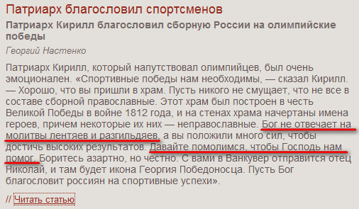 Примечательно, что перед отправкой на состязания, наши спортсмены были массово подвергнуты богослужению с молитвами об успехе. Однако бог, как говориться, не фраер и ложить он хотел на молитвенные просьбы от РПЦ. И это, на мой взгляд, самый показательный итог Олимпиады, который, к сожалению, никто не заметил. Как там поцтреарх-то сказал: «Бог не отвечает на молитвы лентяев и разгильдяев». Ну оно и видно, какие вопросы здесь могут быть?