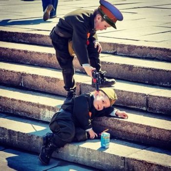 Да ну что вы!Милитаристский косплей у малышей это стрёмно, конечно. Но, народ, разве вы не бегали с игрушечными автоматами и пестиками за гаражами с 5 до 12 лет (+/-), играя за фашистов или за наших? А если была ещё игрушечная портупея и каска, то всё, ты крутейший воен!