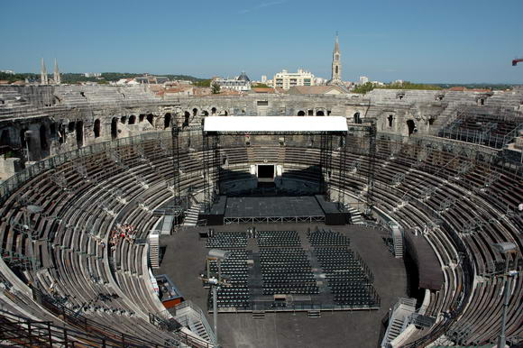 В городе Ниме есть старинный амфитеатр. Он огромный, хотя и не такой большой, как Колизей. Но зато, в отличие от Колизея, амфитеатр почти полностью сохранился (как внутри, так и снаружи). И там проводят различные концерты - в основном оперные.