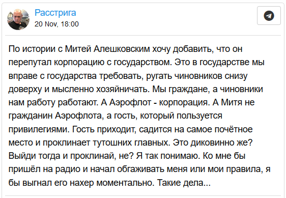 Ну и после этого в бой пошла тяжелая артиллерия - ум, честь и совесть нашей эпохи, неоднократно расстриженный, но заново подстриженный Сергей Леонидович Доренко собственной персоной. Который опубликовал страшно интересный твит, где объяснил, что Алешковский перепутал государственную корпорацию с государством. Это, мол, в государстве можно ругать чиновников (сам Сергей Леонидович временами позволяет себе, да). А вот госчиновника (ну, госменеджера), коим является гендир "Аэрофлота" Савельев, ругать нельзя, потому что Алешковский у Савельева в гостях на почетном месте. И начинает проклинать тутошних главных. Выйди тогда и проклинай, правильно? К нему бы еще пришел на радио и станцевал в мичети. Он бы его выгнал на хер (пишется отдельно) моментально. Такие дела.