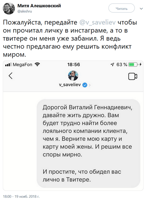 Прочитав это, Митя Алешковский осознал, насколько он был неправ и чего он вообще лишился в этой жизни, после чего у себя в твиттере упал на колени и стал молить Совельева вернуть ему и его жене карточки скидок. Обидно же, ну правда?