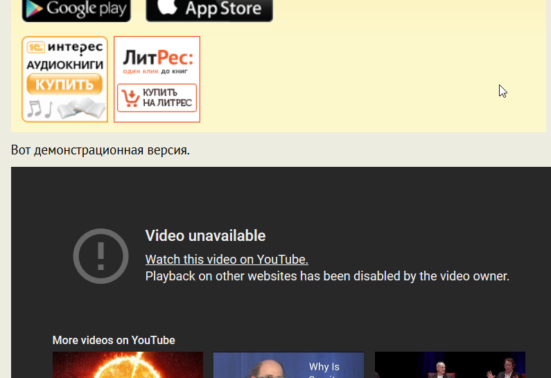 "YouTube: По требованию владельца это видео не воспроизводится на других сайтах." В т.ч. и на сайте самого владельца. 😄