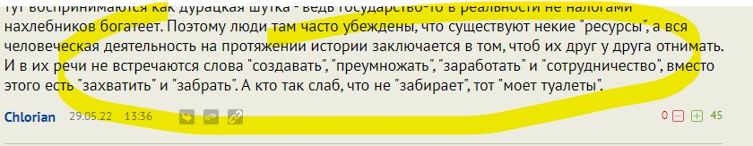 Нет, Deryni, всё гораздо проще. Как раз вчера в "Деконструкции" (youtube) Дробышевский разбирает фильм "Дитя джунглей". Интереснейшая передача сама по себе, но особенно интересно послушать, как были устроены отношения между папуасами на межличностном уровне и между деревнями. Собственно, так это было и везде в первобытном мире. Так вот, 95% россиян из этого мира и не выбрались, и в 19-ом, ни в 20-ом, ни в 21-ом веке. Весь мир на всех уровнях (дом, деревня, государство, глобус) делится по системе "свой-чужой". Чужого можно убить, минимум поиздеваться и ограбить. Совок был корсетом, который держал эту гнусную энергию с рамках, как до Совка старался держать царь, а после - путинская мафия. В перерыве между царем и совком, с февраля 17-ого года до 20-ого, все резали всех (первыми вырезали и пожгли своих же крестьян, выделившихся из общины на отруба). Совок народ не хоронил, просто совковому начальству стало в напряг тащить эту лямку при нефти по 10 долларов (Рейган с Тэтчер подложили свинью), и оно решило перекраситься и всю зону перекрасить из красной в черную. А потом пришёл Путин и ещё раз переделал зону в беспредельную (бандитскую). Вот, собственно, и вся социология России за последние 200 лет...